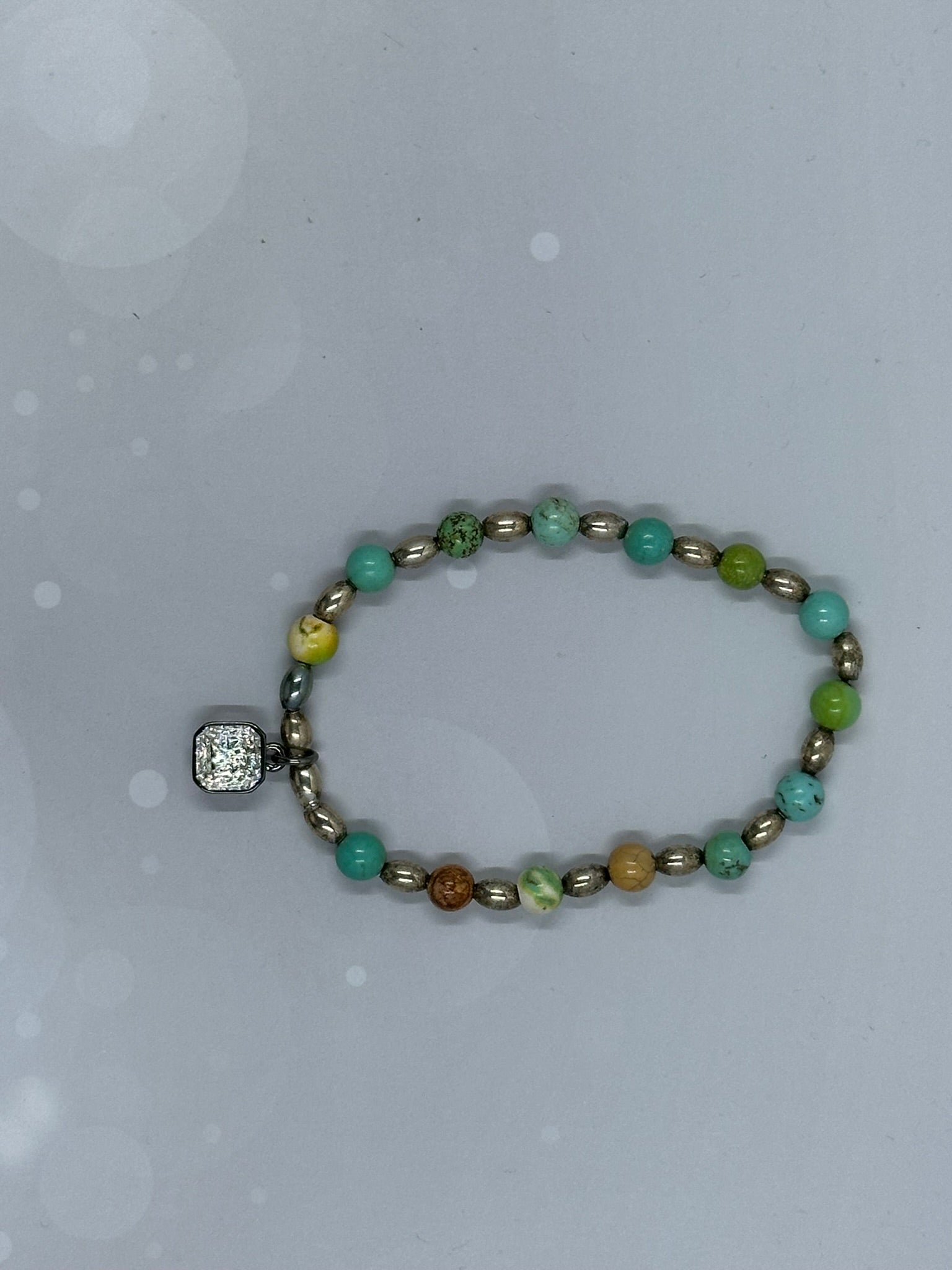 This elegant bracelet pairs the soft, soothing tones of Amazonite with sleek silver-tone spacer beads, finished with a sparkling charm for an extra touch of shine. The mix of aqua greens, earthy neutrals, and metallic accents makes it a versatile piece that can be dressed up or worn casually every day.