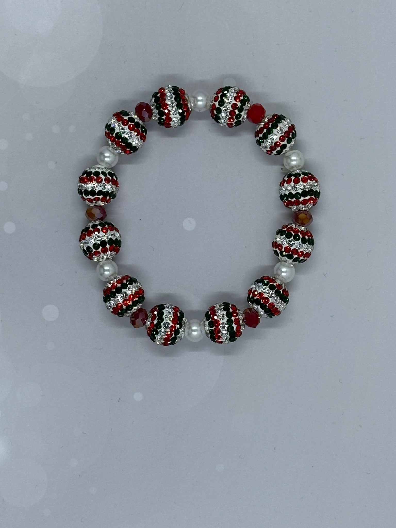 Shimmer and shine this holiday season with this handmade stretch bracelet. Designed with sparkling striped beads in classic Christmas colors—red, green, and silver—accented by glossy pearls and faceted crystals. Lightweight and comfortable to wear, it’s perfect for holiday parties, stocking stuffers, or as a festive gift for someone special.