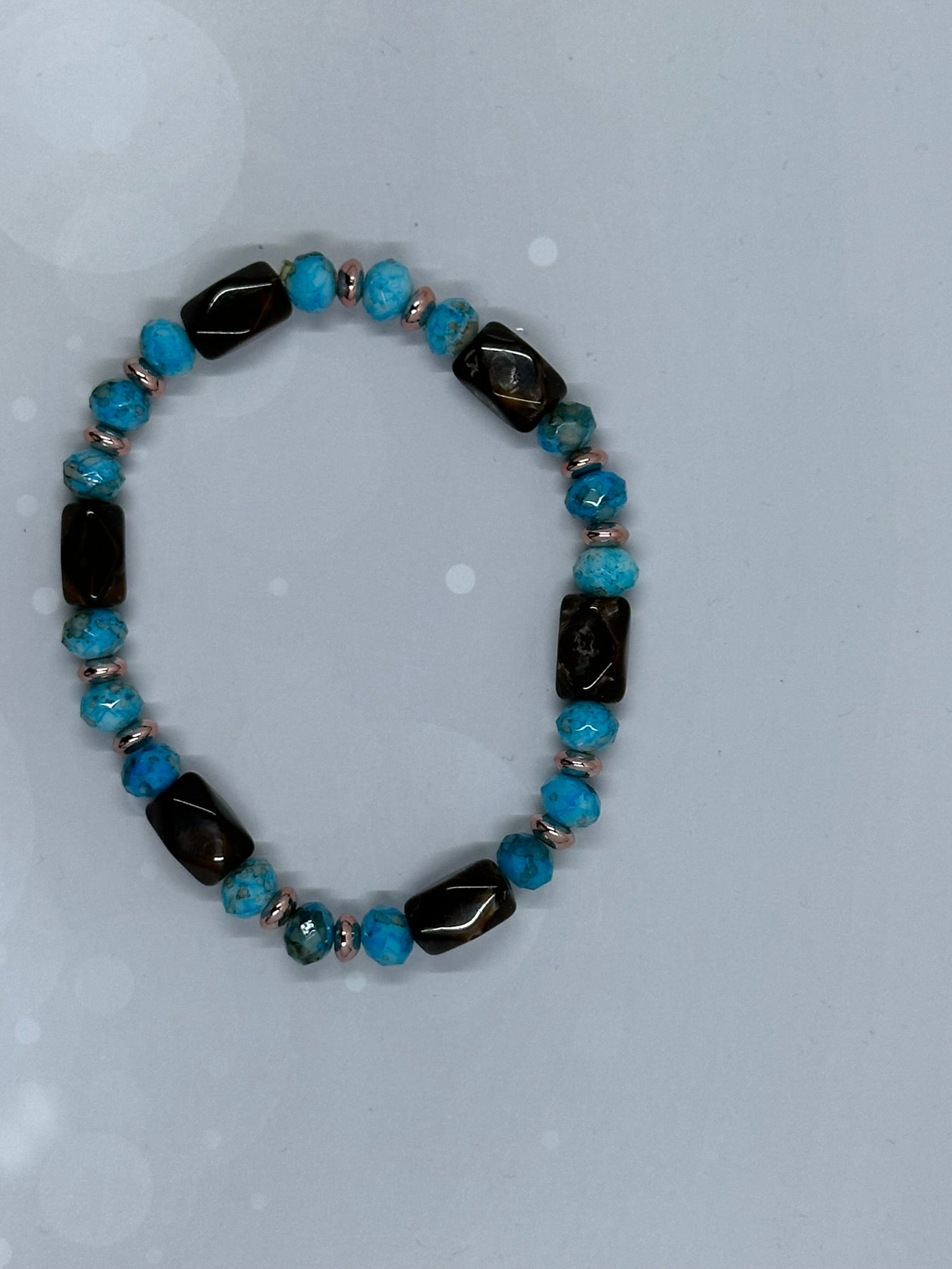 This handmade bracelet features the protective shimmer of Tiger’s Eye, paired with vibrant turquoise-style beads and finished with metallic spacers for a modern touch. A versatile piece that balances natural grounding energy with bold, eye-catching color.